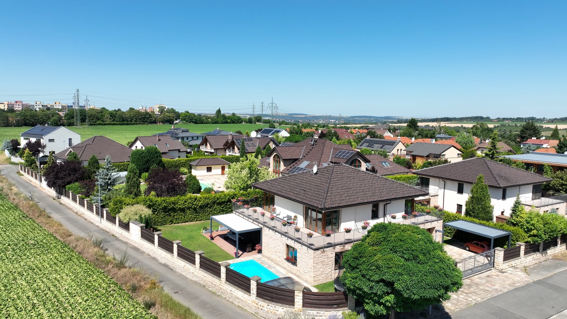 This passive air-conditioned family house with a carefully maintained garden and an outdoor swimming pool is situated on a corner plot in a pleasantly quiet area of Prague 8 – Dolní Chabry, not far from the Kobylisy metro station, the Čimický and Ďáblický forests, and the Drahanské údolí.
