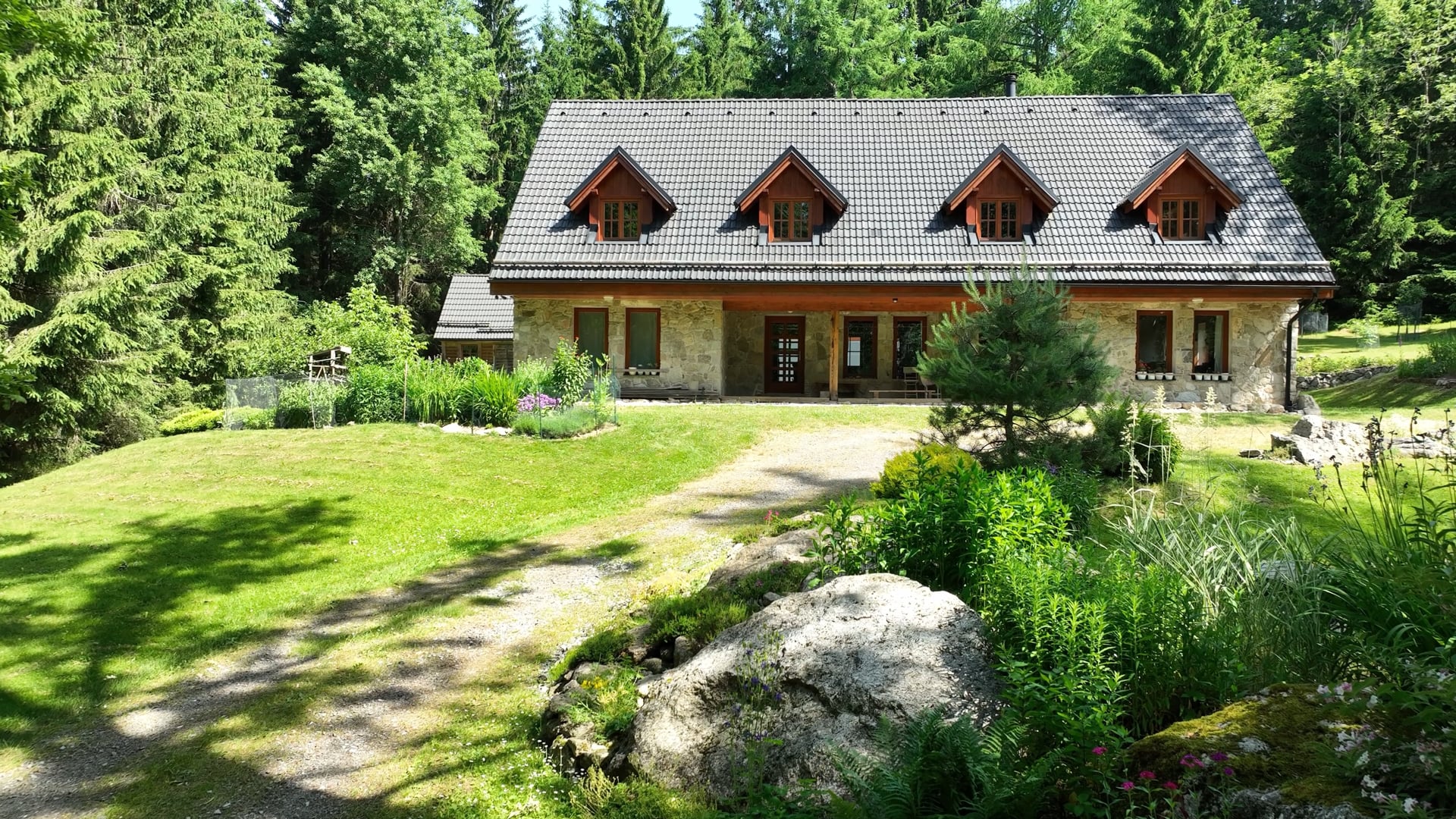 Na parcele o rozloze 3 261 m2 dále stojí dvoupodlažní zateplený domek s elektřinou a krbovými kamny Jotul a uzamykatelná garáž pro 3 auta se skladem a úložnými prostory ve sníženém patře. Další parkovací stání pro 3-4 auta na pozemku, případně u příjezdové cesty, která je celoročně udržovaná obcí. V okrasné zahradě s rozmanitou florou a dekorativními kamennými prvky je vytvořené celoročně čištěné koupací jezírko s pramenitou vodou.